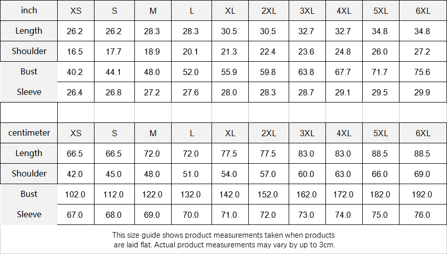 | Inch | XS | S | M | L | XL | 2XL | 3XL | 4XL | 5XL | 6XL |